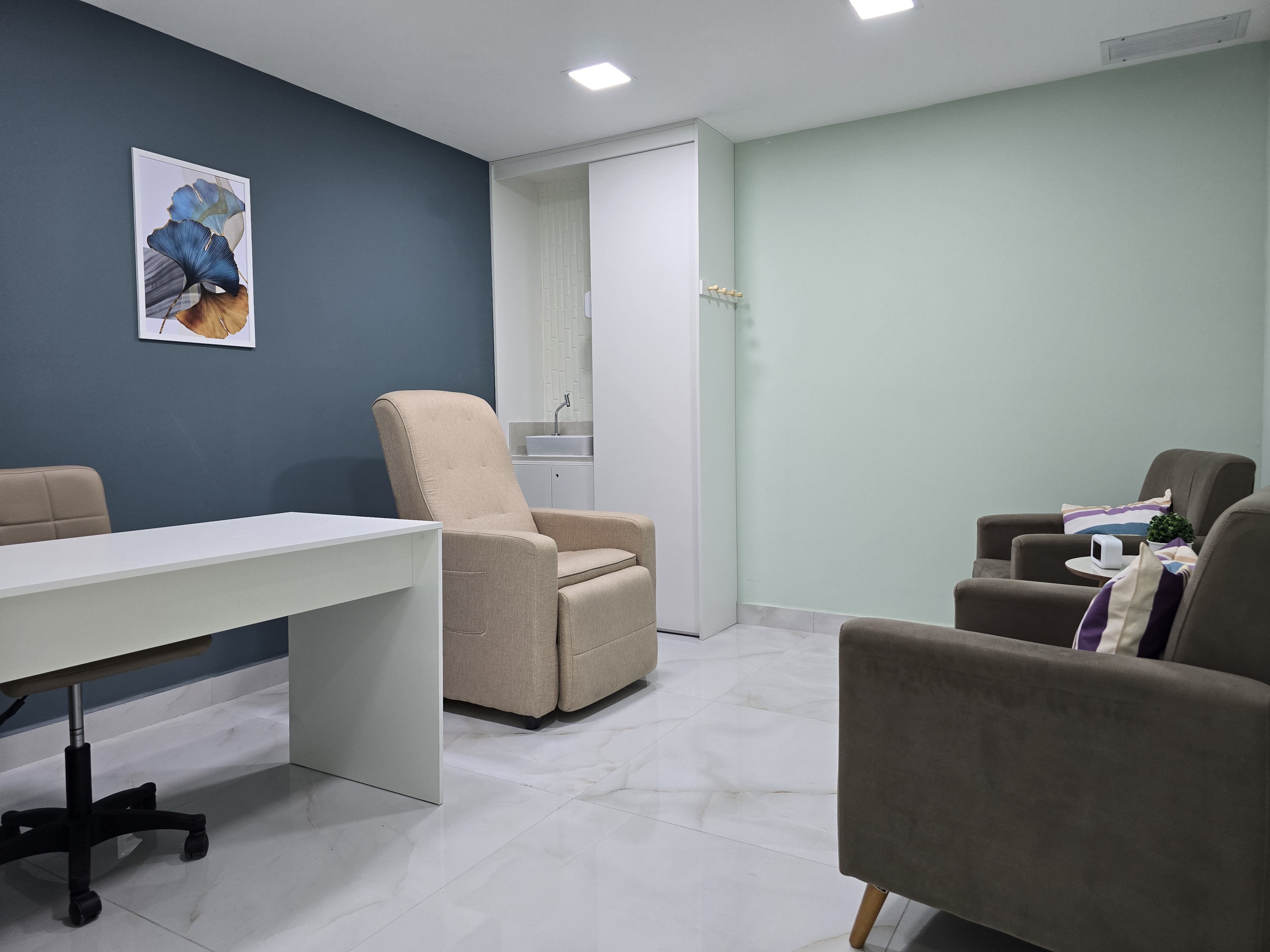 Sala elegante e aconchegante que oferece ao profissional um espaço de atendimento com muito conforto e leveza aos seus pacientes. Esta sala é composta por mesa de escritório com nichos, cadeira, armário com pia embutida, 3 poltronas e mesinha lateral. Além disso, tem disponível uma maca portátil.